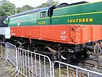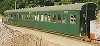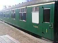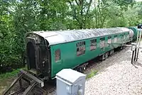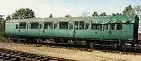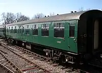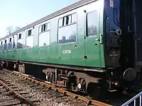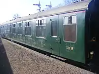 | SR | 11201 | 4-COR DMBTO | Built in 1938 for Set 3142. Preserved by the Southern Electric Group in 1972. Left Ashford Steam Centre in 1976 and went to the Nene Valley Railway where it acted as passenger coaches for the NVR's re-opening train in 1977.[46][47] Cosmetically restored in SR livery and put on display at Horsted Kenyes in 2005 until 2015. In June 2017, 11201 moved to a private site in Sellindge, Kent with two other carriages from 4-COR set 3142.[48] | ![]() |