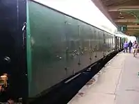 | SECR | 971 | Hundred Seater | Built in 1923. Withdrawn from traffic in 2007 for what was hoped to be a quick overhaul. Examination revealed a much heavier amount of work was required on the carriage's side panels and underframe, as well as a need to replace rotted sections of the roof and internal partitions, as well as re-trimming of the seats. The carriage is currently in store awaiting restoration. | ![]() |