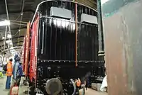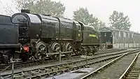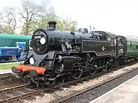 | SR | 2-6-0 | Maunsell U Class | Maunsell Locomotive Society[10] | No. 1618. Built in 1928. Arrived at Bluebell 1977 from the Kent & East Sussex Railway. Last worked in 1994 and is on static display awaiting a 10-year overhaul. Its tender was loaned to the Watercress Line in 2010 as a replacement for classmate 31806's, which was heavily damaged in a fire at Ropley. The tender was returned to the Bluebell in mid-2011, 31806's having been repaired. 31618 has been painted in lined BR black to match the tender, and to smarten the appearance of the engine up after many years in the shed. The overhaul is not likely to start until the work has completed on others. Its overhaul requires boiler work, including firebox and re-profiled tyres. | ![]() |