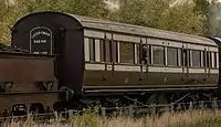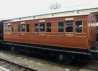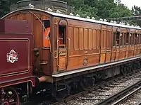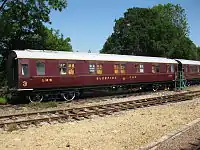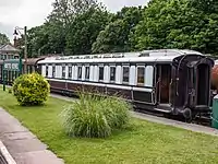 | LNWR | 74 | Semi-royal saloon | Built in 1903. This carriage was withdrawn in 1971 and preserved in 1973 by 7029 Clun Castle Ltd. Arrived on the Bluebell in October, 2000. Later repainted in LMS Wartime livery, then the carriage was returned to LNWR livery. Offered for sale at the end of 2012, later moved to the Lavender Line when it had still not been sold. Later in use as an Indian restaurant in Polhill, in Kent. | ![]() |