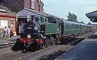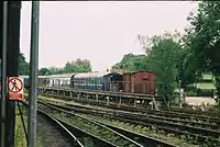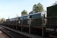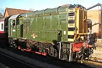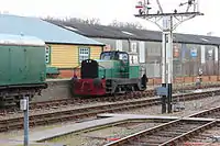 | British Rail | 0-6-0DM | Class 09 | D4106 (previously 09018). Bought by a consortium of locomotive department volunteers, D4106 is on loan to the railway on an "at-cost" basis where the railway hires it until the members receive their funds back. The higher gearing of an 09 compared to an 08 allows it to be used in emergencies on passenger services at 25 mph, a role it undertook for the first time during summer 2013. | ![]() |