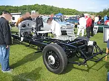 The chassis of the Phantom II was completely new. The front axle was mounted on semi-elliptical leaf springs as on earlier 40/50 hp models, but the rear axle was now also mounted on semi-elliptical springs instead of cantilever springs. This, along with the drivetrain changes, allowed the frame to be lower than before, improving the handling.[1][3] The 4-wheel servo-assisted brakes from the Phantom I were continued, and the Bijur centralized lubrication system from the Springfield-built Phantom I was included on all Phantom II chassis.[1]