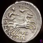 Eventually a new reverse appeared, first Luna driving a biga (two horse chariot) in 194–190 BC, and then Victory driving a biga in 157 BC – thought to refer to the final defeat of Perseus of Macedon at the battle of Pydna by Lucius Aemilius Paulus in 168 BC.[19] These Victory "bigati" became the most common type of denarius. Denarii were marked with special symbols (such as a star or an anchor) from very shortly after their introduction and soon monograms indicating the tresviri monetales (mint masters, often called moneyers, that were responsible for the issue) were on the coins. In some cases the symbols are "punning". The example reverse shown to the left (RRC 187/1 showing Luna driving a biga) is one such; a shell symbol appears above the horses along with the letters "PVR" below. The shell is thought to be a murex shell; this was the source of Tyrian purple (in Latin: purpureo) and this, along with the letters, is thought to refer to a Furius Purpureo.[20] This type of reference to the moneyers became more and more explicit, and eventually developed into self-advertising to further the political career of the moneyers.
