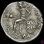 Families who had already had members in the Senate were more likely to have further family members elected to political office (and thus become senators). This was so much more likely that only a few consular novi homines (new men) are known to history. Advertising on coins was thus often about the moneyer's family. In the coin reverse shown on the right (RRC 268/1b), the legend around the outside indicates that moneyer was N. Fabius Pictor. The seated individual is wearing a cuirass, holding a spear in his left hand and an apex, the characteristic hat worn by the flamines, in his right. At his side there is a shield inscribed QUIRIN. This is taken to refer to Q. Fabius Pictor (probably the son of Quintus Fabius Pictor the annalist) who was elected praetor in 189 BC and assigned the province of Sardinia by lot (Livy 37.50.8). He was also the flamen Quirinalis and because of this, P. Licinius Crassus, the pontifex maximus of the day did not allow him to take the Sardinian office because of various taboos surrounding the flamen's person, and the need for the flamen to perform certain rites in Rome (Livy 37.51.3–7).[21] The Sardinian praetorship was exchanged for both the urban and peregrine praetorships, and N. Fabius Pictor remained in Rome.[22][23] The entire incident was part of the political manoeuvring of Scipio Africanus against his attackers, which included the Fabii.[24]
