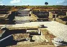 In reality, the thermae constitutes one of the more relevant examples of private Roman baths complexes in the Portuguese territory, and was constructed in two phases after the construction of the residential homes.[2] They included the apodyterium (where people would practice exercises), the laconicum (or sauna), the strigilus (where residents would scrub dirt and oils from their bodies), the caldarium (where they would bath in a warm pool) and, finally, the tepidarium or frigidarium (where they would repose).[2] These spaces surround a central atrium (or peristylus) marked by columns framing a central pool (impluvium), with access to the north by a staircase.[1][2] Along the southern flank is a large patio. To the west of the peristylus is a hall of larger dimensions decorated by a semicircular wall with a small lake in the centre.[1][2] To the west of the residential group are bathing rooms that included praefurnium and three halls, with a central rectangular space.[1] The extremes are terminated by semi-circular caldarium over arches supporting columns, round the rectangular tank with a five degree incline access. To the north, are 10 columns divided at a distance of 2.3 metres (7.5 ft).[1][2] To the south of the villa, and parallel to the river is a large 40 by 8.3 metres (131 ft × 27 ft) pool with a six-step access. Many of the pavements in the halls are covered in black and white mosaics, with the oldest being polychromatic with geometric or animal designs.[1][2] In a few of the chambers there are slabs of marble for flooring and part of the walls, with remnants of stucco on these latter walls.[1][2]