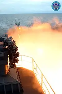 For anti-submarine warfare there are two triple 533.4 mm torpedo tubes, rotatable on either side amidships, firing 53-65K torpedoes or SET-53 anti-submarine torpedoes.[7] The anti-submarine armament is complemented by two RBU-6000 Smerch-2 depth charge rocket launchers on the fore superstructure, reloaded automatically from below the superstructure deck.[7] Their range is up to 6 km, and the weight of the warhead is 31 kg.[9] In the 1990s, they replaced the initially installed 16-barrel RBU-2500 Smerch-1 launchers, manually loaded.[7]