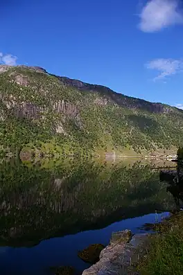 Romarheimsfjorden is a fjord in Vestland county, Norway. The fjord flows through the municipalities of Modalen, Alver, and Osterøy. The western end of the fjord lies near the island of Hokøy where the fjord flows in to the Osterfjorden on its way out to sea. The fjord extends eastward from Hokøy for 11 kilometres (6.8 mi) along the border of Alver and Osterøy municipalities before entering Modalen where it continues to the Mostraumen, a 60-metre (200 ft) wide channel that is 650 metres (2,130 ft) long. On the other side of the channel, the fjord continues for another 18 kilometres (11 mi) where it is usually called the Mofjorden. That fjord ends at the village of Mo.[1]