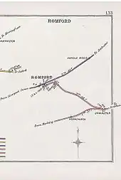 The first line proposed to link Romford to the north shore of the River Thames was put forward by the Thames Haven Railway and Dock Company who proposed a 16 miles (26 km) line from Romford to Shell Haven. An Act of Parliament was obtained in 1936 and powers were renewed 10 years later but no work was ever commenced.[3]