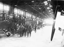 Building 1-A was the main facility for DH-4 assembly. Aircraft manufactured in the United States were dis-assembled and crated prior to shipment to East Coast Seaports. There, the crates were loaded onto ships that sailed north to Halifax, Nova Scotia where they were assembled into convoys for the trans-Atlantic crossing. Upon their arrival in European waters, the ships were unloaded either in England or ports in France. The aircraft crates were loaded on flatbed rail cars and routed to Romorantin. This also included the Liberty L-12 aircraft engines, built by Ford, Cadillac, Lincoln, Packard, and General Motors. Upon arrival, the aircraft fuselage and wing components were re-assembled, along with the pilot cockpit instruments, seat and controls. The engines would be installed along with the propeller, fuel tank and the machine guns; bomb racks and other combat equipment.[3]