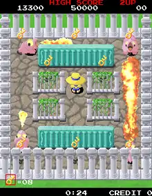 The player takes control of Chap (チャップ, Chappu), a gardener wearing a straw hat, who must collect all the keys in 61 maze-inspired gardens in order to rescue his girlfriend, Rumina (ルミナ, Rumina); he can push the walls in the gardens over to crush the various enemies that pursue him, but they shall immediately be resurrected in the form of eggs which hatch after a few seconds. Each round also has a preset time limit to ensure that the player does not dawdle - and once it runs out, a green-haired female vampire known as Tsukaima (使い魔, Tsukaima) (who cannot be crushed by the walls) shows up and pursues Chap for his blood, as the Yamaha YM2151-generated song (and all the enemies) speed up. The game's enemies include white blobs known as Pyokorin (ピョコリン, Pyokorin), pink Triceratops-esque creatures known as Kerara (ケララ, Kerara) which can breathe flames, armadillos known as Gororin (ゴロリン, Gororin) which can roll over Chap, purple seals known as Todorin (トドリン, Todorin) which can breathe ice, sponges known as Bekabeka (ベカベカ, Bekabeka), which can push walls onto Chap, turquoise blobs known as Fumajime Pyokorin (ふまじめピョコリン, Fumajime Pyokorin), which occasionally pause to take a long drag on their cigarettes, helmet-wearing creatures known as Nachibo (ナチ坊, Nachibō), which take two crushes to kill, wolves known as Taggus (タッグス, Taggasu) which can throw bombs at Chap, spiders known as Oogumo (オオグモ, Oogumo), which can spin webs for Chap to run into - and this game's main antagonist, an evil scientist named Gurerin (グレリン, Gurerin) who only appears on the final round, where players not only have to collect all the keys, but also push the walls onto his four clones (two of whom can breathe fire, but the other two can breathe ice).