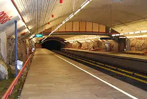 Romsås is a subway station on the Grorud Line of the Oslo Metro in the Grorud borough. It is located in the tunnel between Grorud and Rommen. It's in a mountain and smells moist. Like Ellingsrudåsen, Romsås has natural mountain walls. The architect Håkon Mjelva together with civil engineer Elliot Strømme and entrepreneur F. Selmer were awarded the "Concrete board for outstanding construction" in 1976.