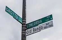 The Rondo Commemorative Plaza was installed in July 2016 on Old Rondo Avenue (Concordia Avenue) just west of North Fisk Street. It includes a vertical exhibit displaying the Rondo story, benches, a performance area, and a tower with a lit beacon that is visible from I-94.[25] Funds were provided by a variety of sources, including a Community Development Block Grant from the City of St. Paul and donations from several local foundations and the 3M African-American Employee Network.[7][3][8][40]
