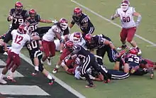 As a sophomore in 2011, Hillman was named a third-team All-American by the Associated Press,[14] and earned his second straight first-team All-MWC selection.[15] He rushed for 1,711 yards and 19 touchdowns during the season. He ranked fourth among all players in the NCAA Football Bowl Subdivision with an average of 131.6 rushing yards per game.[16] He ranked third in total rushing yards.[17] He gained over 100 rushing yards in eight of San Diego State's 12 games in 2011.[18][19][20] On September 17, 2011, the San Diego State Aztecs faced the 2–0 undefeated Washington State Cougars at Qualcomm Stadium. Hillman scored on four touchdown runs, leading the Aztecs to a 42–24 victory and their first 3–0 start in 30 years. On October 29, 2011, he gained a season-high 224 yards against Wyoming for 2 touchdowns, including a 99-yard touchdown run.[21][22]