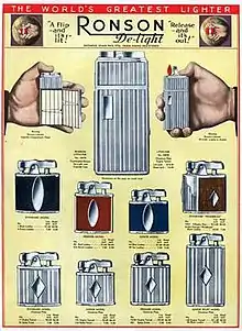 When, in time, technological advances were developed to allow for the manufacture of a safe flint material in 1906, Louis Aronson's ambition for an automatic pocket lighter soon became a reality. In 1913, Louis Aronson applied for a patent for a Liter (lighter), which was approved. In 1926 he released a new "automatic operation" Banjo lighter, which offered to both ignite and extinguish in a single push.[33] It was a great success, demand shortly exceeding supply, spurring Aronson to patent it and design other products around the invention, which were marketed under the Ronson brand name.[34] Under his leadership, the Art Metal Works began designing prototypes, and patented several generations of Igniting-Apparatus until finally arriving at the Banjo Lighter. Ronson received an exclusive patent, in 1926, for a new automatic style of lighter that worked with one hand, and in 1927 Ronson began marketing it as the Ronson De-Light Lighter with the slogan "A flip - and it's lit! Release - and it's out!" Ronson's new lighters were an overnight success worldwide and soon the company offered a variety of lighters for all tastes.[35][36][37][38][39] As with the Art Metal Works output, many well-built and stylish early Ronson lighters demand high prices in the collectibles marketplace.[40][41][42]