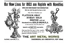 All accounts state that Louis Aronson was a gifted man, who at 16 years old set up a money-making shop in his parents' home - before receiving a U.S. patent for a commercially valuable metal-plating process he developed when he was 24 years old, and he sold half the rights while retaining the Right to Use. "His experiments, which he has been conducting since his early youth, resulted in 1893 in the discovery of a process for electrically producing tinplate. Much money was expended upon improving the process... and has been of great practical value to the whole industry.[7] Retaining its rights, he sold half the patent rights, and later used part of the proceeds to open the Art Metal Works in Newark, N.J.[8] Soon the company was producing a variety of high-quality Lamps, Book ends, Art Statues and other decorative items, prized today for their detail in the collector marketplace.[9][10][11][12]