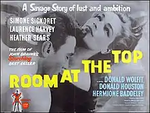 Room at the Top is a 1959 British drama film based on the 1957 novel of the same name by John Braine. It was adapted by Neil Paterson (with uncredited work by Mordecai Richler), directed by Jack Clayton (his feature-length debut), and produced by John and James Woolf. The film stars Laurence Harvey, Simone Signoret, Heather Sears, Donald Wolfit, Donald Houston, and Hermione Baddeley.