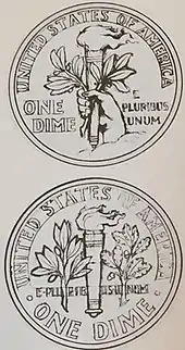 Numismatist Mark Benvenuto suggested that the image of Roosevelt on the coin is more natural than other such presidential portraits, resembling that on an art medal.[4] Walter Breen, in his comprehensive volume on U.S. coins, argued that "the new design was ... no improvement at all on Weinman's [Mercury dime] except for eliminating the fasces [on its reverse] and making the vegetation more recognizably an olive branch for peace."[18] Art historian Cornelius Vermeule called the Roosevelt dime "a clean, satisfying and modestly stylish, no-nonsense coin that in total view comes forth with notes of grandeur".[19]