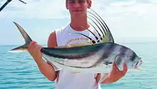 Roosterfish can reach over 1.6 m (5 ft 3 in) in length and over 50 kg (110 lb) in weight.[4] The weight of the average fish hooked is about 20 lb (9.1 kg). The fish is popular as a game fish, but it is not considered a good eating fish. Catch and release is strongly recommended.