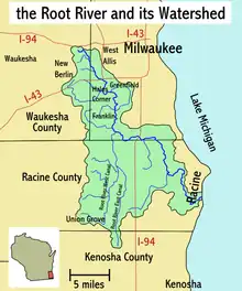 The Root River is a 43.7-mile-long (70.3 km)[1] river that flows to Lake Michigan at the city of Racine in southeastern Wisconsin in the United States. Racine and Racine County are named for the river, as racine is the French word for root.