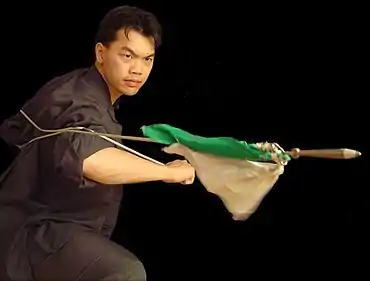 While relatively new, rope dart is used in the object manipulation scenes due to its impressive performances.[3] Because of this, there have been modifications to the original design. Some rope darts have been created to be set alight.[4] A section of fireproof chain between the dart or meteor head and the rope attaches it securely and Kevlar wicks form the flammable head. Other rope darts have heads filled with LED lights.[5] Both of these can be performed in the dark, adding excitement and mystery.