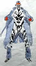 While Moore came up with Rorschach's name and descriptions, Dave Gibbons was in charge of the character's appearance. In Gibbons' initial designs, Rorschach wore white clothing which had inkblots not only on his head but all over his body. He also wore a large blue trench-coat, red gloves, red-blue hat and items that look like jodhpurs or spats over his boots.[11] When designing the characters of the series, Gibbons said Rorschach was his favorite to draw due to his relatively simpler features. He described: