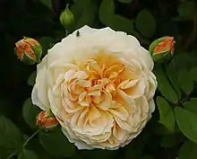 David C. H. Austin (1926 – 2018) was an award-winning rose breeder, nursery owner and writer from Shropshire, England. He began breeding roses in the 1950s with the goal of creating new shrub rose varieties that would possess the best qualities of old-fashioned roses while incorporating the long flowering characteristics of hybrid tea roses and floribundas. His first commercially successful rose cultivar was 'Constance Spry', which he introduced in 1961. He created a new, informal class of roses in the 1960s, which he named "English Roses". Austin's roses are generally known today as "David Austin Roses".[4] Austin attained international commercial success with his new rose varieties. Some of his most popular roses include 'Wife of Bath' (1969), 'Graham Thomas' (1983), 'Abraham Darby' (1985) and 'Gertrude Jekyll' (1986).[5]