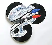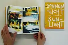 In her art work, Rosa Lachenmeier mainly combines painting and photography, setting new accents in the fields of collage.[2] Immediately after her studies, she explored the possibilities of using everyday objects such as vinyl records, plates or shirts as image carrier for her paintings. With her screen objects in the late 1980s, she reflected on media conditions of our time and with the focus on a global view on the earth she asked questions about our constantly changing perception.[3] In the 1990s, she devoted herself to the artist's book as the bearer of an artistic concept, sometimes as a dialogue of word and image, sometimes as a visual sequence of pictorial metamorphoses. These artist's books are distributed by Printed Matter, Inc.[4] in New York and Boekie Woekie in Amsterdam, both artist-operated and artist-specialized stores.
