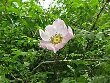 Rosa hirtula, the sanshou-bara or Hakone rose, is a species of flowering plant in the family Rosaceae.[1][2] It is found only in the vicinity of Mount Fuji and neighboring Mount Hakone in Japan, and is the town flower of Hakone.[3][4] The pale pink, single flowers can be as wide as 7.5 cm (3 in).[2] Quite unusually for a rose, it can take on a tree-like growth form.[5]