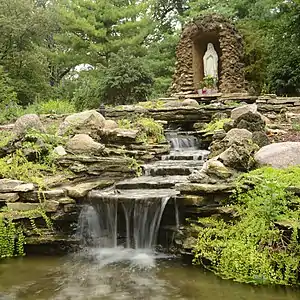 In 1929, the Shrine to Our Lady of Lourdes, more commonly known as the Grotto, was commissioned by the Class of 1930, following fundraising led by Sister M. Benita Newhouse. The Grotto was modeled after the Shrine to Our Lady of Lourdes in Lourdes, France, and blessed in October 1929.[35] The Grotto was built on an artificial mound in the northwest corner of the River Forest campus, with a rock niche containing a statue of the Virgin Mary, a waterfall constructed of stacked limestone slabs and a pond ornamented with porous limestone rocks and planted with evergreen shrubs and irises. The pond was filled in after the 1960s but was restored in 2008 for the 150th anniversary of the visions of St. Bernadette in Lourdes, and the garden area was restored again in 2013.[36]