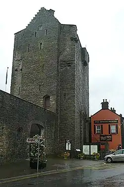 There is no surviving reference to the granting of a royal charter for the founding of Roscrea and it is likely that the town began to grow around the castle in the 13th century, adding to the existing ecclesiastical settlements. There are references to 'the burgesses of Roscrea', two mills and a town oven, which is accepted as proof that Roscrea was a medieval town.[23] In 1315, when Sir Edmund Butler was created 1st earl of Carrick (he later distinguished himself during the Bruce Invasion of Ireland), he was granted the castle and manors of Carrick and Roscrea, along with the attached lands. The castle remained in the Butler earl of Ormond's possession until it was sold by the 2nd duke of Ormond in 1703. The earls of Ormond had good relations with the local Éile (Ely) O'Carroll family, the ancient Gaelic lords of the area, and intermarried with them. The earls were largely absent from Ireland between c. 1464–1514, being engaged in the Wars of the Roses in England, and left the running of their lands to junior members of their extended family. Today the Catholic church of St. Cronin is built close to the site of a ruined Franciscan friary, which was founded by the O'Carrolls about 1477.[24] Some portion of the walls of the old Friary has been retained in the modern church building.[25]