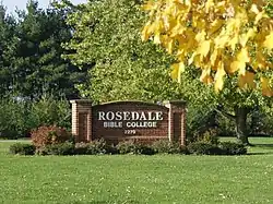 RBC began in 1952 near the town of Berlin, Ohio, as a six-week Bible school that met in a local Mennonite church.[3] The school was founded to equip students to grow spiritually and academically to serve effectively in the church and society. In 1964 the college moved to its present campus and became known as Rosedale Bible Institute. The ensuing years saw growth in both course offerings and length of the school year. In conjunction with accreditation and degree granting privileges recognized by the Ohio Board of Regents, the institution changed its name in 2001 to Rosedale Bible College.[4]