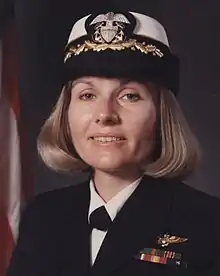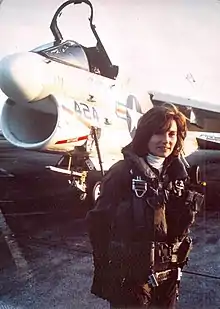 Rosemary Bryant Mariner (then Rosemary B. Conatser) joined the United States Navy in 1973 after being selected as one of the first eight women to enter U.S. Navy pilot training. She completed Officer Candidate School in Newport, RI, then headed to Naval Air Station Pensacola, Florida for basic flight training.[9] She was designated a Naval Aviator in June 1974 and became one of the first six women to earn their wings as a United States Naval Aviator, alongside Barbara Allen Rainey, Jane Skiles O'Dea, Judith Ann Neuffer, Ana Marie Fuqua, and Joellen Drag. In 1975, Mariner was one of the first female military aviators to fly a tactical strike aircraft, a single seat A-4L Skyhawk.[1] In 1976, she transitioned to the A-7E Corsair II, making her the first woman to fly a front-line tactical strike aircraft.[10]