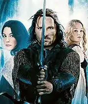 Shippey comments that the leading women may have seemed insufficiently prominent to some of those responsible for marketing Peter Jackson's The Lord of the Rings film trilogy. He noted that a publicity shot for The Two Towers depicted Viggo Mortensen as Aragorn with upheld sword in the centre, with Arwen and Éowyn on either side to give the impression of a love triangle. He commented that to do that, "pretty drastic" changes were required, not least because Tolkien has Éowyn only speak 42 words, of which just 5 are to Aragorn; whereas in the film, Éowyn appears in 14 out of 62 scenes. Similarly, he notes, Arwen does not speak at all in Tolkien's The Two Towers, whereas she features "prominently" in 3 scenes in the film. To achieve this, the film uses material on Arwen from Appendix 5, while for Éowyn, Shippey states, some of Gandalf's dialogue is given to Grima Wormtongue so that Éowyn can appear directly.[53]