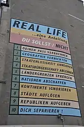 Through installation and audience participation Real Life has sought to challenge the conventional exhibition practice and connect with the public. These projects have been exhibited worldwide.[9] Throughout the course of the project, a consistent thread of Sinclair's work has sought to address the nature of the individual, collective and national identities of Scotland.[5]