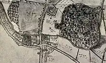 Rotherfield Park is an ancient estate first mentioned in 1015 as Hrytherafeld[2] meaning 'the open land for cattle.'[3] There was likely settlement here predating the medieval hunting park which is first mentioned in the 16th century. The evidence for the park can still be seen today as a complex of ditches running around the estate.[4] The estate has undergone a number of changes over the centuries, the first major one being the creation of pleasure grounds there in the 18th century, of which many features still exist. A detailed map of the estate was made at some point in the 1600s (see right), it is likely stored in the Rotherfield Park Estate Archives along with a wealth of other records which has unfortunately been kept hidden from researchers and historians.