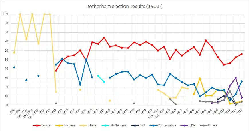 Rotherham has consistently returned Labour MPs since a by-election in 1933, following the earlier period before 1923 dominated by the Liberal and Conservative parties. The numerical Labour majority in every general election from 1935 onwards has been in five figures, with the exceptions of 2015 and 2019.