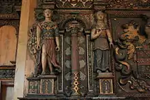 The chimneypiece of the Rotherwas Room is of oak, a material widely used in English household construction.[30] Its woodwork is a product of the union of artisanal tradition of the English countryside and an interest in architectural ornamentation arriving from Renaissance Italy.[31] The incorporation of Italian decorative elements into the stylistic vocabulary of English builders was not exceptional at this time.[8] From 1560 to 1610 Italian designs arrived from northern European countries, particularly the Netherlands, in the form of engraving pattern books.[32] These include Sebastiano Serlio's The Five Books of Architecture and Wendel Dietterlin's Architectvra: Von Außtheilung, Symmetria vnd Proportion der Fünff Seulen, as well as treatises such as Vries's "Perspective" and Rivius' "Oder Architectur aller Furnensten Baukunst". The illustrations within these books lacked precision in both form and scale, leaving the craftsman to interpret information according to local tradition and personal expertise.[33] This phenomenon explains the Italian influence on the English style of woodwork that dominates the mantelpiece. The most frequently occurring decorative elements are found in the wainscoting of the Rotherwas Room.[8] Although the identities of the craftsmen are unknown, the figural carvings on the mantel bear similarity to contemporary works by the Huguenot sculptor Maximilian Colt at Robert Cecil, 1st Earl of Salisbury's Hatfield House, which dates from the same period.