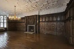The paneling of the Rotherwas Room is made of walnut, a highly valued imported wood most likely imported from Germany or the Netherlands.[36] While oak was widely used in construction in the Rotherwas estate due to its abundance on the five thousand acre property, large walnut trees did not exist in England prior to 1650 and were rarely used in English paneling if at all.[8] The wainscoting design of lower inner-framed tiers and upper-arcaded panels divided by pilasters and capitals is extremely similar to that of Billesley Manor, Warwickshire and Carbrook Hall, near Sheffield.[37] According to Charles Bodenham, the two doors cut out of the paneling were added in 1611 and 1732 respectively.[38]