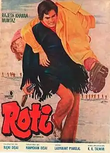 Roti (transl. Chappati) is a 1974 Indian Hindi-language action film, produced by Rajni Desai and Rajesh Khanna under the banner Aashirwad Pictures Pvt. Ltd and directed by Manmohan Desai. It stars Rajesh Khanna and Mumtaz, with music composed by Laxmikant Pyarelal. This film was released on 18 October 1974, along with Benaam and Roti Kapda Aur Makaan.[1] Kader Khan was reportedly paid ₹1.21 lakhs for writing dialogues for the film.[2] The film was remade in Telugu as Neram Nadi Kadu Akalidi, starring N.T. Rama Rao and Manjula.