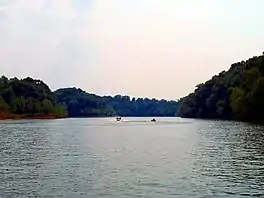The Rough River is a 136-mile-long (219 km)[1] tributary of the Green River in west-central Kentucky in the United States. It's located about 70 miles southwest of Louisville, and flows through Breckinridge, Hardin, Grayson, and Ohio counties. Via the Green and Ohio rivers, it is part of the watershed of the Mississippi River.[2] According to the Geographic Names Information System, it has also been known historically as "Rough Creek".[3] In the 1950s it was dammed, creating Rough River Lake.