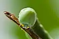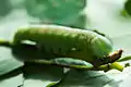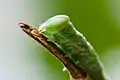 The larva is blue green, turning bright green as it approaches pupation age. It has a large head capsule, yellow mandibles, and yellow longitudinal stripes down its body. It feeds on the leaves of oaks and other deciduous trees (see list below). The larva is sometimes called the green oak caterpillar.