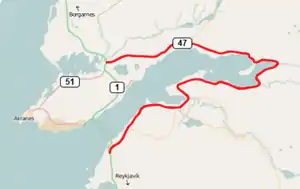 Hvalfjarðarvegur (Icelandic pronunciation: [ˈkʰvalˌfjarðarˌvɛːɣʏr̥]) or Route 47 is a road in Iceland rounding the Hvalfjörður fjord. It was formerly part of Iceland's Route 1 (Ring Road) until it was bypassed by the Hvalfjörður Tunnel opened in 1998. The road is 61 km long.
