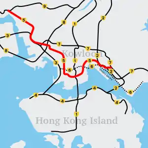 Route 5 (Chinese: 五號幹綫) is a strategic route[1] in Hong Kong from eastern to western Kowloon and New Kowloon, and ends in Tsuen Wan in the New Territories where it connects to Route 9. It is one of the most seriously congested routes in Kowloon, as it serves as an interchange to the Hung Hom Cross-Harbour Tunnel, especially during peak hours.