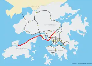 | Tsing Sha Highway (Sha Tin T3, Tai Wai Tunnel, Sha Tin Heights Tunnel, Eagle's Nest Tunnel, Lai Chi Kok Viaduct, Stonecutters Bridge, Nam Wan Tunnel), Lantau Link (Tsing Ma Bridge, Ma Wan Viaduct, Kap Shui Mun Bridge), North Lantau Highway | ||||