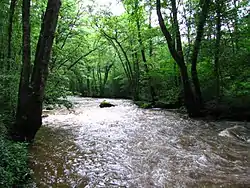 This last part of its course is through small wooded gorges and its fast waters can make for good kayaking, when the water level permits, and fishing for brown trout. These gorges are home to animal and plant species such as pearl mussels and Osmond Royal (water-fern),[2] and one may occasionally see otters and salmon.