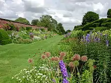 When Egerton-Warburton took over the estate, the gardens were mainly to the east of the hall, but with his wife, Mary, he designed new gardens. These were developed to the southwest of the hall between 1840 and 1860. They implemented their designs apparently without any professional help, and the present gardens are largely the result of their planning. The herbaceous border was one of the first of its type to have been created in England.[38] Items they planted which are still present include the yew finials in the herbaceous border, which were planted in 1856, and the holly oak cylinders in the Ilex Walk, which were also planted in the 1850s.[39]