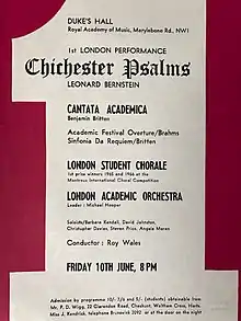 On 6 June 1966, Wales conducted the first London performance of Leonard Bernstein's Chichester Psalms with the London Academic Orchestra, London Student Chorale and Pro Arte Singers in the Duke's Hall of the Royal Academy of Music. Bernstein's work also featured in the official opening concert of the University of Warwick Arts Centre in October 1974, in the presence of the Composer, who was the recipient of an Honorary Doctorate from the University.