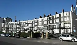 Royal Crescent forms a shallow crescent-shaped of 14 terraced houses on a generally east–west layout behind Marine Parade.[18] Numbers 1 and 14, the houses at each end, stand parallel to that road.[18] Each four-storey house has common stylistic themes. There is a first-floor veranda on every house except number 1, the westernmost house, which has a balcony instead. Each veranda has curved metal roofs (with either cyma recta or cyma reversa mouldings), cast iron railings and bracketed supports.[22]