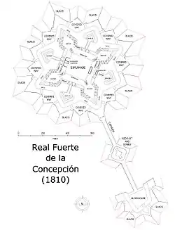 Brigadier General William Cox, the military governor[14] of Almeida was in charge of the works. He attempted to enlist Spanish labourers to do the work but was unsuccessful, and he was forced to use soldiers of the Portuguese 9th Line to complete the work. The rebuilding were overseen by Captain John Burgoyne[15] of Corps of Royal Engineers. As well as the Portuguese soldiers, Burgoyne also had a small collection of skilled Portuguese stonemasons and carpenters at his disposal. The workforce set about clearing all the debris in the surrounding ditches caused by the French demolitions, and palisades were erected. Repairs were also made to the bastions at the north end of the fortress. The bridge into the fortress was repaired along with the drawbridge, covered walkways and gates.[16] Burgoyne was also ordered to sink mines into the two previously undamaged formidable bastions.[17] Six tons of gunpowder[17] were piled in barrels in each of the four demilunes, and more barrels of powder were stacked in the casemates of the adjoining curtain walls to the four bastions. Further explosives were placed in the central arch of the fort's redoubt and the casemates and blockhouse to the south east of the fortress were packed with a total of three tons of powder.[17] The strategy behind these set charges was that, if the fortress was likely to fall into the hands of the French, the retreating garrison would ignite the charges, destroying the fortress and preventing the French from using Concepcion as a base to attack Almeida.[13]