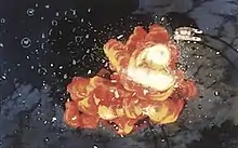 A deliberate exception to Royal Space Force's general design approach was the rocket itself, which was adapted from a real-world Soviet model.[148] This exception was later noticed by Hayao Miyazaki, for whom it formed one of his two criticisms of the anime; he was surprised that a film which had gone so far as to change the shape of money did not make the rocket more unusual.[149][lower-alpha 23] Yamaga argued that although the anime reaches its eventual conclusion through a process of different design paths, it was necessary to end the film with a rocket inspired by reality, lest the audience see it as a story about a different world that has nothing to do with them.[151] In their roundtable discussion with OUT, Gainax described the rocket as also emblematic of the film's approach to mecha; despite its many mecha designs, they all play supporting roles, and even the rocket is not treated as a "lead character".[152]